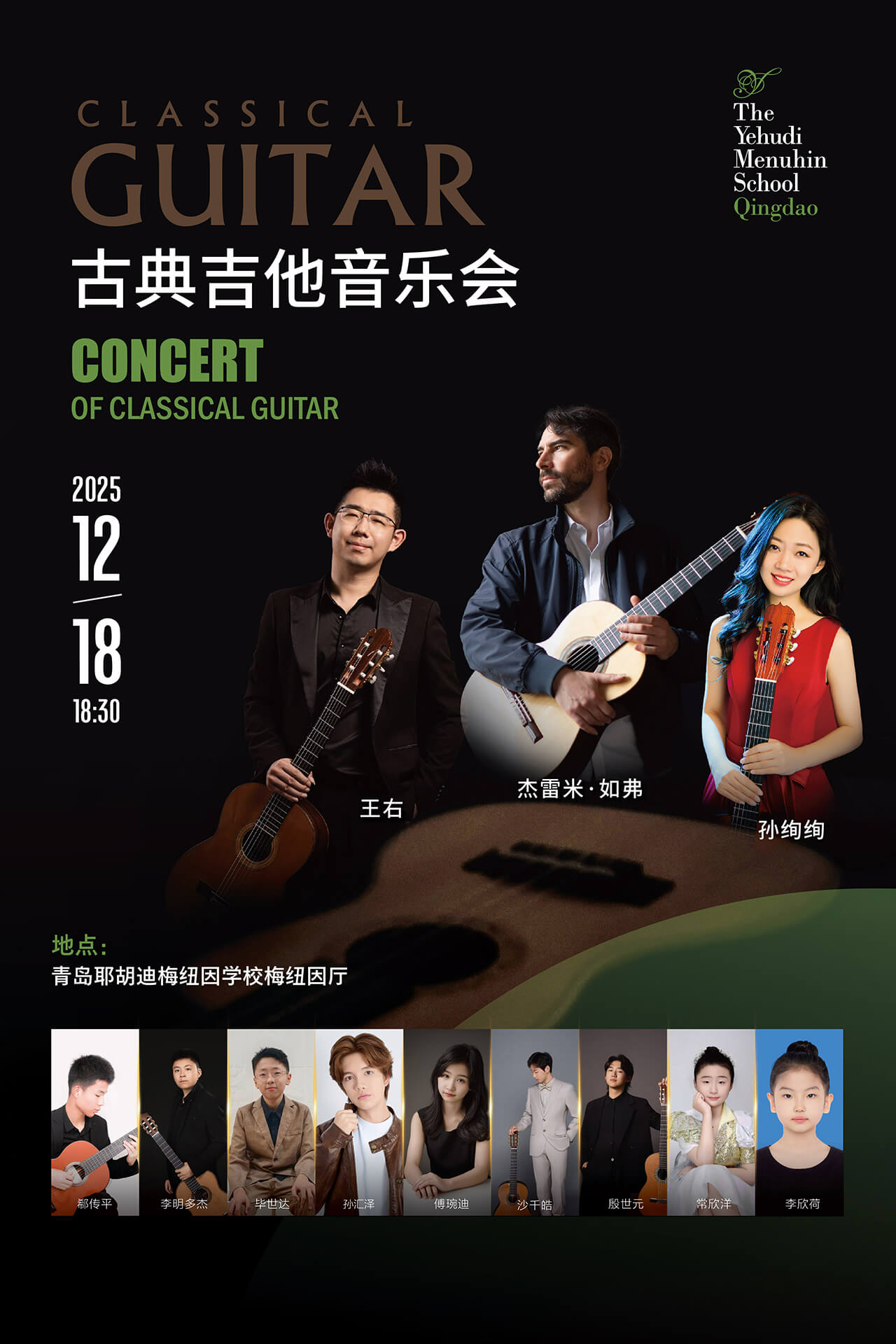 12月18日(周四)18:30,青岛耶胡迪梅纽因学校梅纽因厅将呈现一场特别的古典吉他音乐会。我校古典吉他副教授王右、青年吉他演奏家孙绚绚,将与世界当红的法国吉他演奏家杰Jérémy Jouve及我校古典吉他专业学生们同台演出,呈现一场融汇中西的古典吉他之夜。