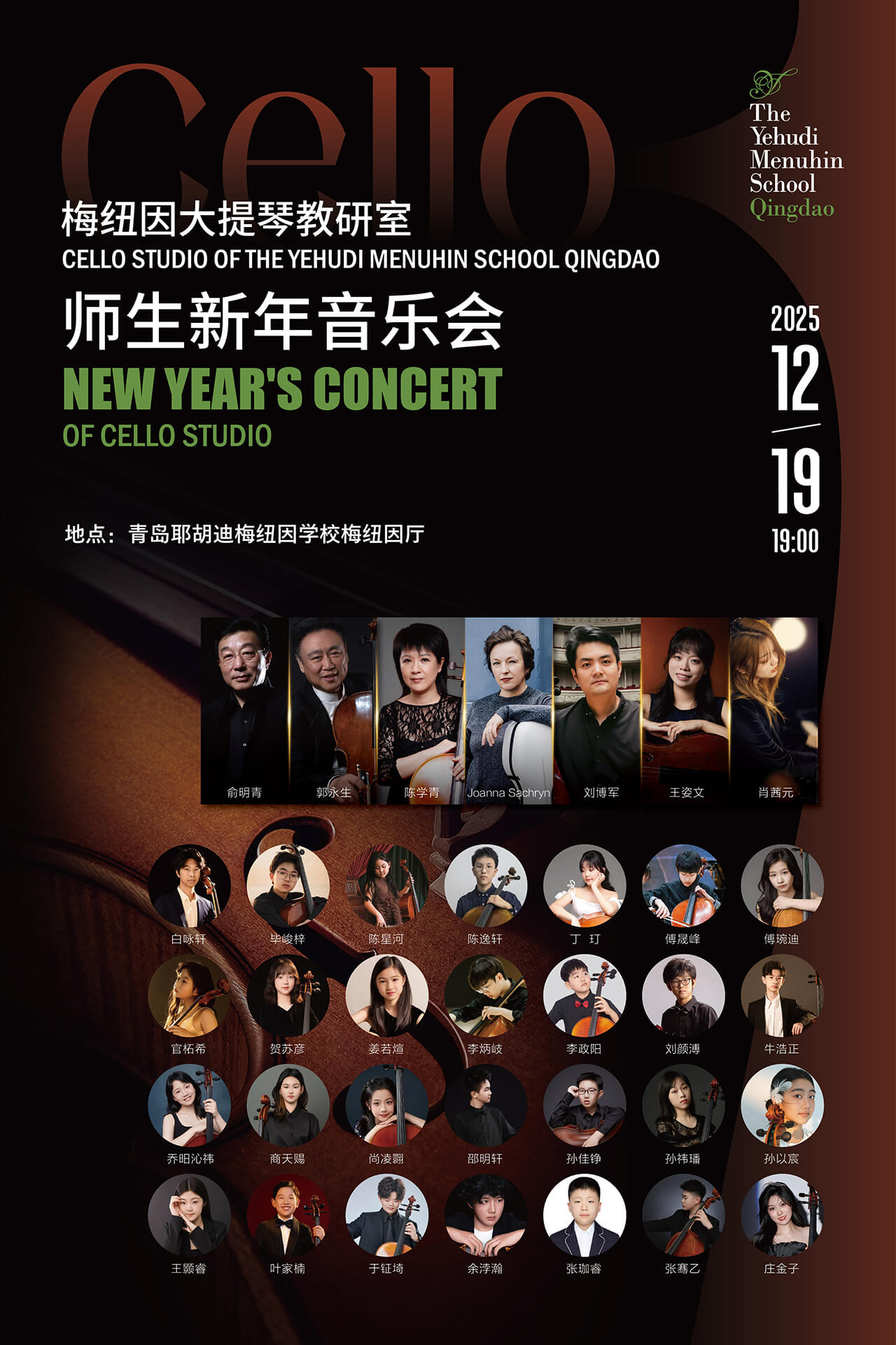 岁末琴音,温暖启新。12月19日晚,青岛耶胡迪梅纽因学校大提琴教研室将呈现一场师生联袂的新年音乐会。在教研室主任俞明青教授的带领下,师生们将以独奏、重奏、合奏等形式,演绎多首经典曲目,展现大提琴的深沉魅力与系统教学的丰硕成果。