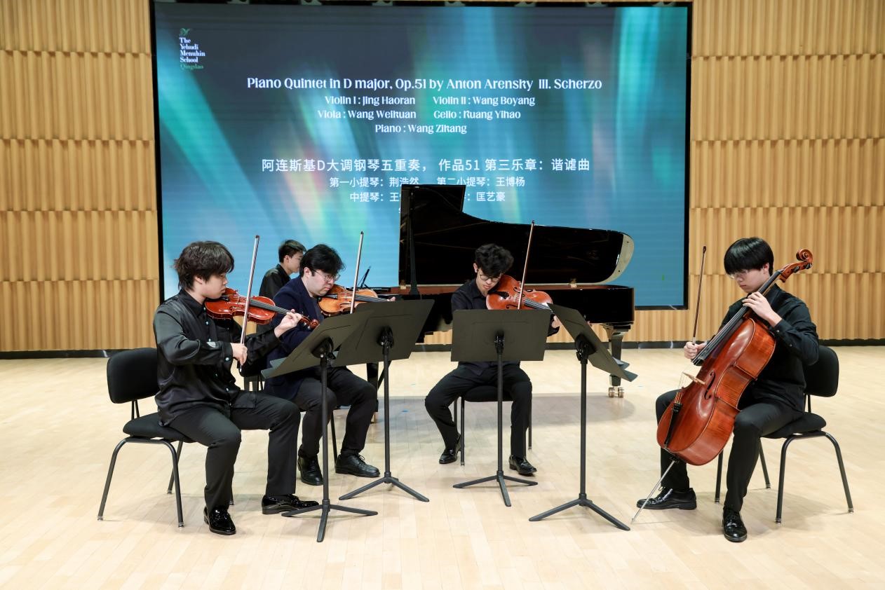 青岛梅纽因的同学们也在本场演出中奉献了精彩演出,包括荆浩然(第一小提琴)、王惟宽(中提琴)、匡艺豪(大提琴)、王梓康(钢琴)及王博杨老师(第二小提琴)共同演绎的安东·阿连斯基《D大调钢琴五重奏》第三乐章:谐谑曲,展现出协作技艺的精准与默契,少年们的气场,当仁不让。十二年级毕业生陈昊洋以独奏钢琴形式,呈现了勃拉姆斯艺术歌曲的魅力,再次展现了梅纽因学子扎实的音乐功底。他们无论专业度还是情感的表现力都彰显出卓越的实力,现场观众中不乏各音乐院校的专家和艺术家,纷纷对孩子们的表现惊叹不已。