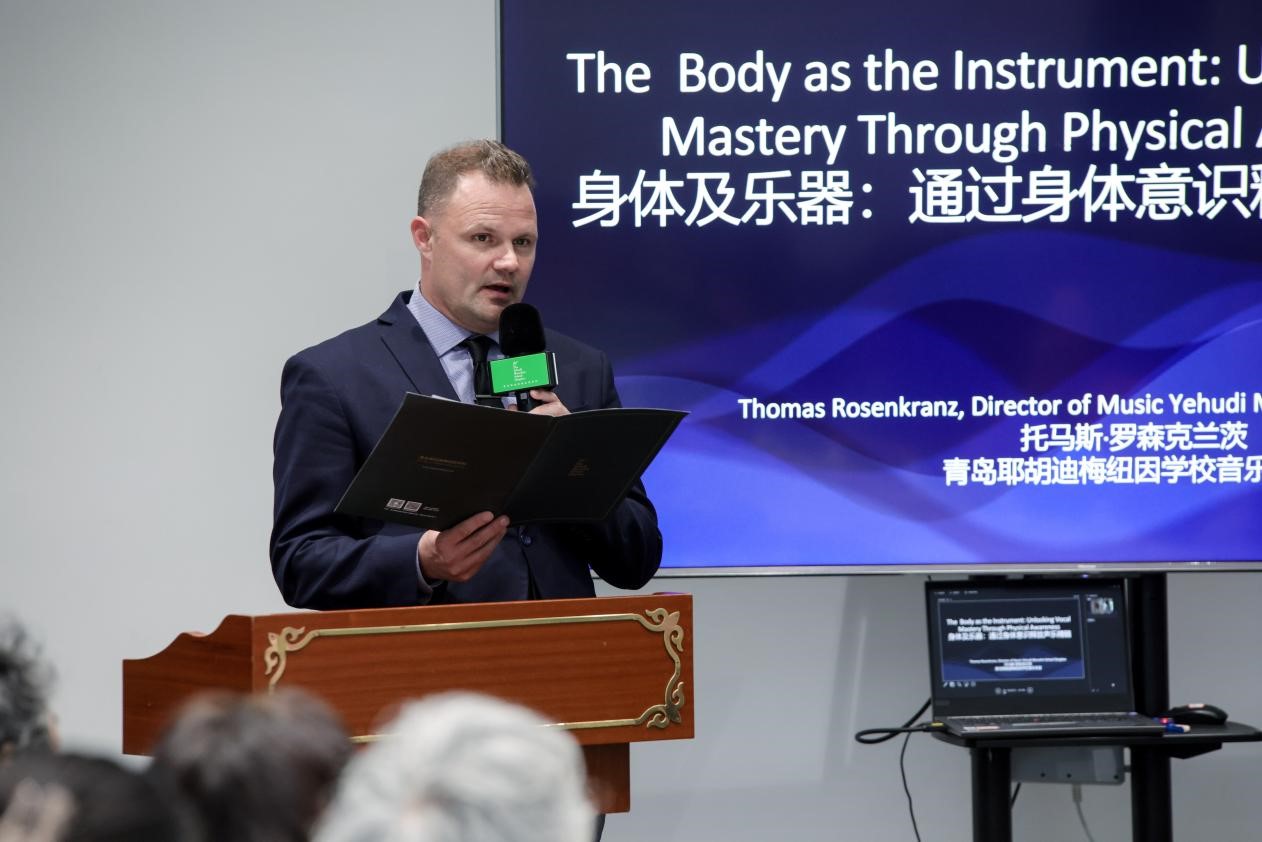 “音乐是流动的”,青岛梅纽因学校音乐总监、钢琴教授托马斯·罗森克朗茨以《身体即乐器:通过身体意识释放声乐精髓》为主题,结合西方古典、印度古典及巴基斯坦卡瓦利音乐案例,解析身体与声音的共生关系,倡导乐器演奏者借鉴歌唱家的呼吸逻辑,通过身体感知增强音乐表达的连贯性与情感张力,并强调“沉默与呼吸的空间”对艺术呈现的重要性。