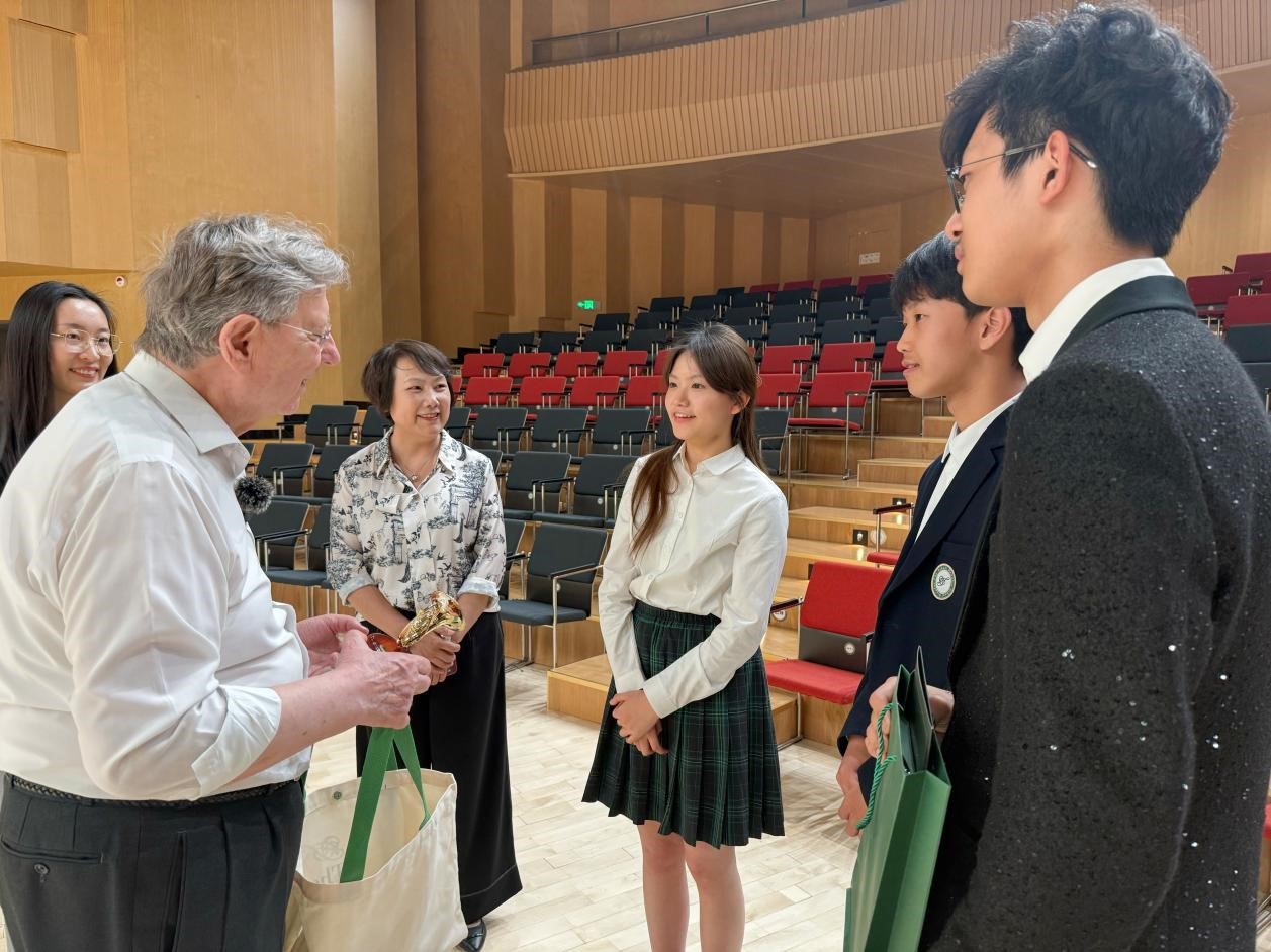 艾格博士与我校三名优秀学生代表:高一蔡钧屹(小号)、高三王惟宽(小提琴)、高二葛金沂(小提琴)进行了亲切交流,并现场聆听了演奏。他高度赞赏了同学们的精湛技艺与艺术表现力,认为“这些孩子的自信与主见,正是‘全人教育’理念培养出的优秀特质”。尤其对王惟宽同学今年以优异成绩获得美国茱莉亚学院小提琴与中提琴双专业offer及高额奖学金表示赞叹,称其“展现了世界级音乐学子的潜力”。艾格博士如朋友般与大家畅谈学业规划,还开心地收下了同学们赠予他的乐器模型礼物。