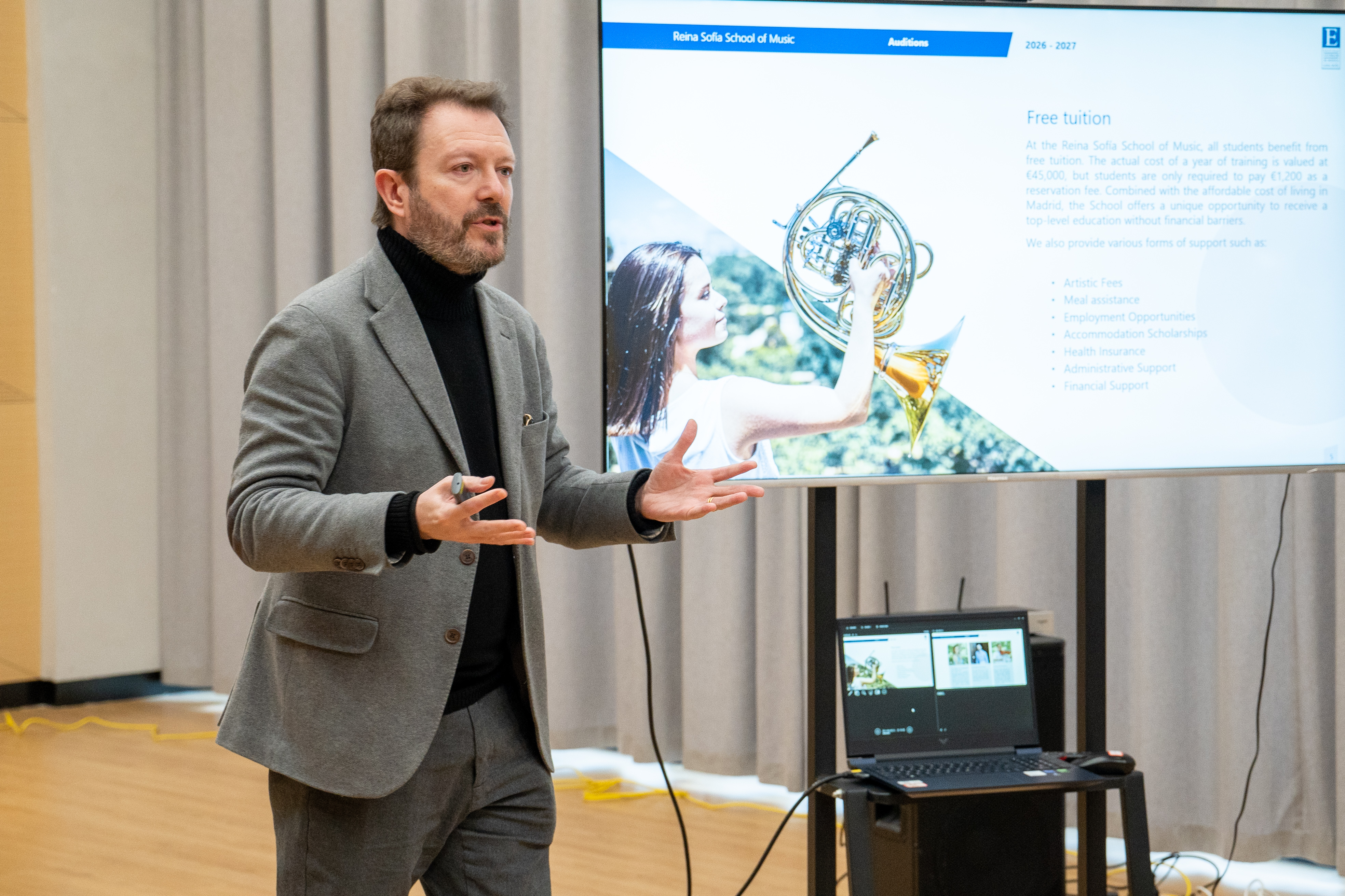 当天下午,一场面向学生与家长的升学指导讲座如期举行。奥斯卡院长详细介绍了西班牙索菲亚音乐学院的办学特色、招生政策与奖学金体系。现场互动热烈,学生们就专业方向、备考准备等踊跃提问,奥斯卡均给予了耐心细致的解答。