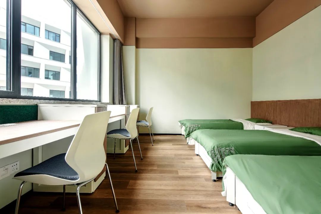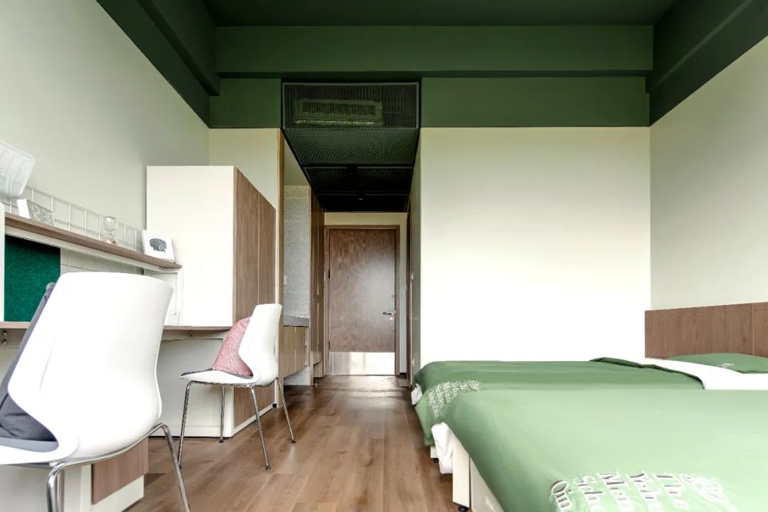 宿舍房间包括双人间和三人间,配有干湿分离的洗手间、全棉床品、符合人体工学的学习桌椅以及独立衣柜,由星级酒店的服务团队定期进行宿舍清洁以及床品的洗涤更换。