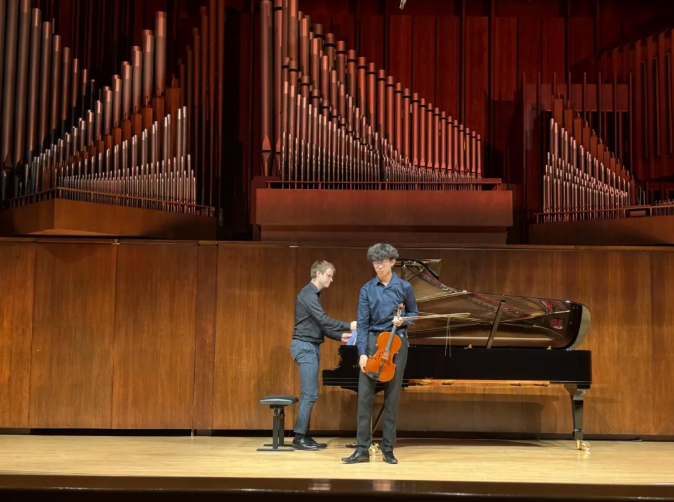 在青岛梅纽因的岁月里,基于“个性化学习和培养方案(ILP)”,学校为他量身定制了“小提琴主修+中提琴第二专业”的进阶路径;小提琴教研室聚焦于“技术精度与艺术感染力”的打磨,通过个性化、互动型的课程,激发他的创新精神,为他提供多维的成长空间;在小提琴教授Tymur Melnyk与中提琴副教授蔡雷的悉心指导下,他打下了坚实的专业基础,更学会了如何在不同乐器间构建和谐的音乐世界观,同时辅以丰富的实践机会,让他从一名青涩学子成长为从容稳健的演奏者。